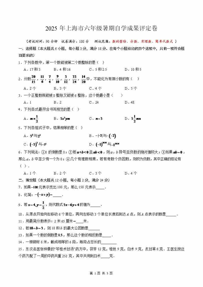 六年级暑期自学成果评定卷(测试范围:数的整除、分数、有理数、简单代数式)(原卷版)