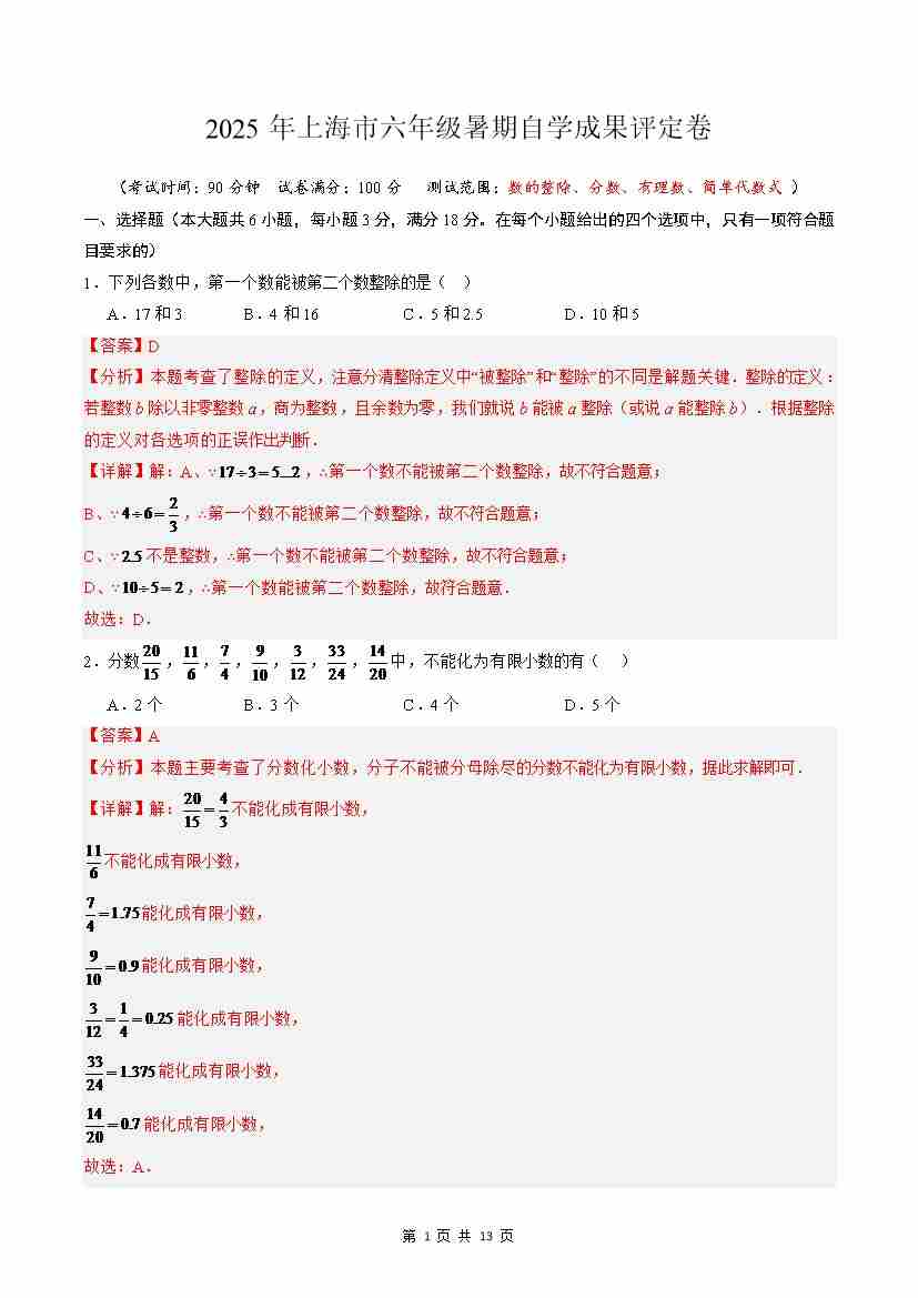 六年级暑期自学成果评定卷(测试范围:数的整除、分数、有理数、简单代数式)(解析版)