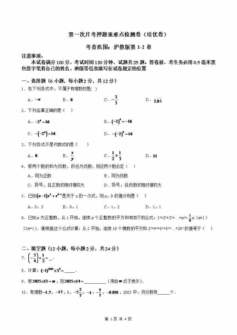 第一次月考押题重难点检测卷(培优卷)(考试范围:沪教版第1-2章)(原卷版)