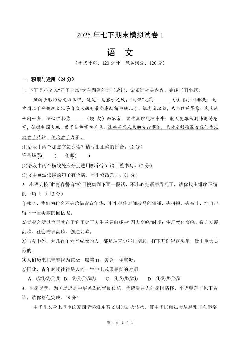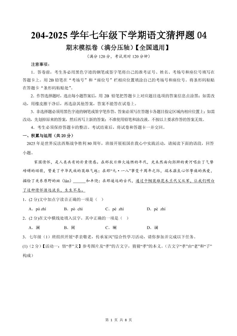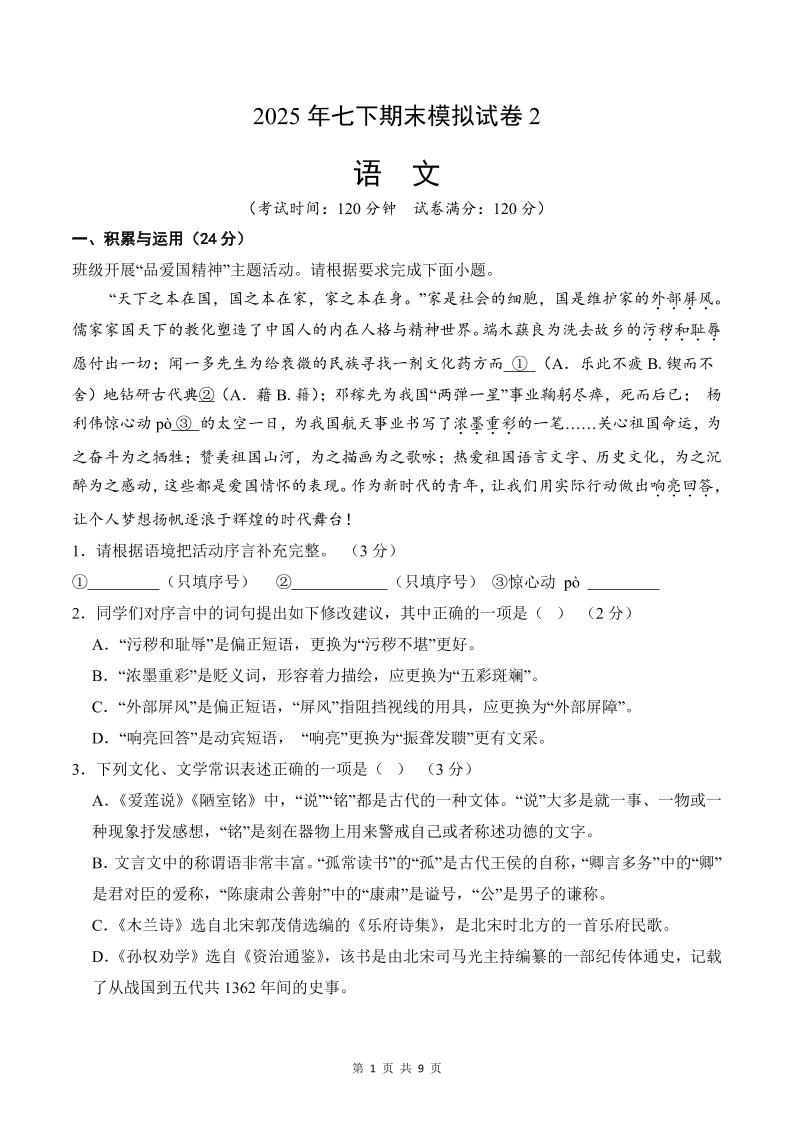七下语文模拟试卷2(原卷版).
