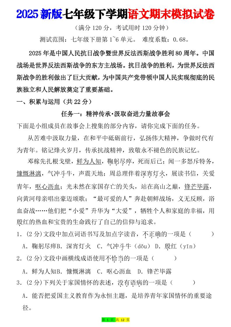 PDF.七年级语文下学期期末模拟试卷1(原卷版)