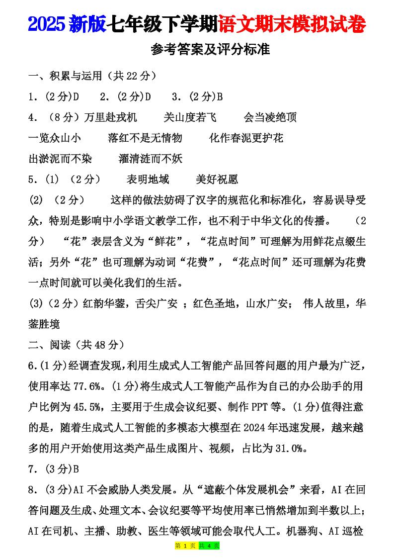 PDF.七年级语文期末模拟卷01(参考答案及评分标准)(统编版)