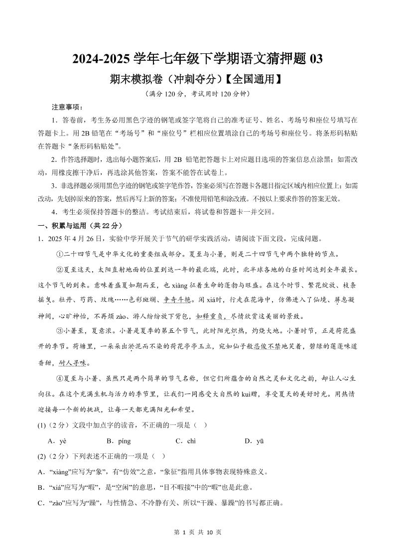 2024-2025学年七年级语文下册期中模拟试卷(含答案)01