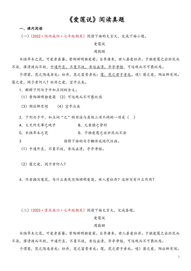 专题04《爱莲说》阅读真题(原卷版)(部编版)