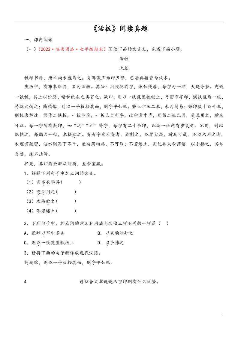 专题05《活板》阅读真题(原卷版)(部编版)