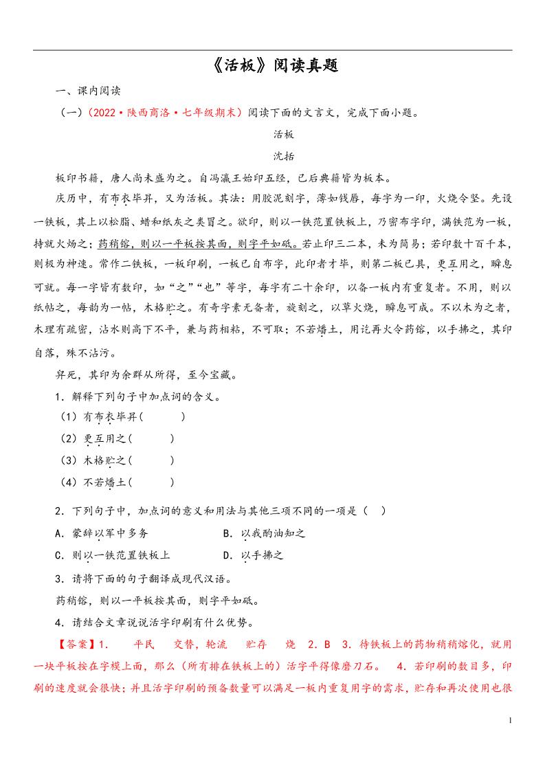 专题05《活板》阅读真题(解析版)(部编版)