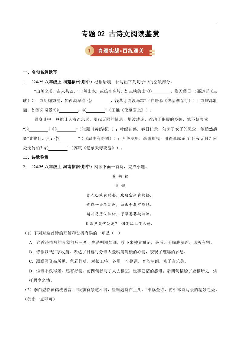 专题02 古诗文阅读鉴赏(期中专项训练)(原卷版)