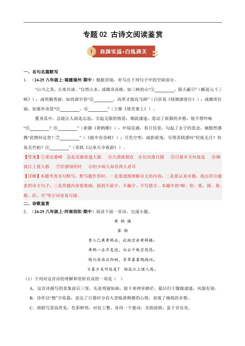 专题02 古诗文阅读鉴赏(期中专项训练)(解析版)