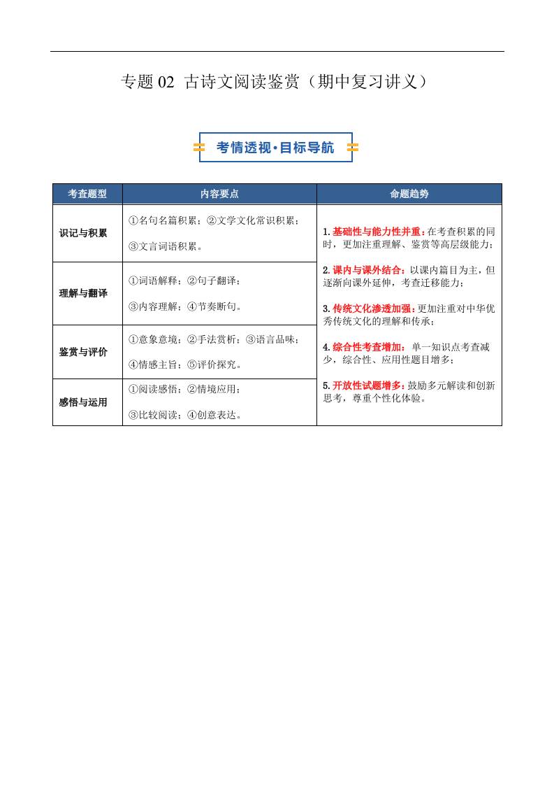 专题02 古诗文阅读鉴赏(期中复习讲义)(原卷版)