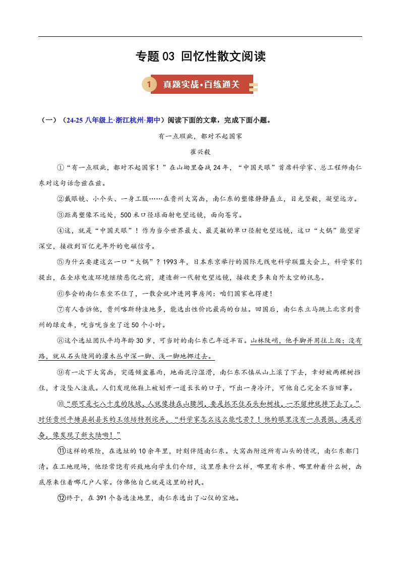 专题03 回忆性散文阅读(期中专项训练)(解析版)