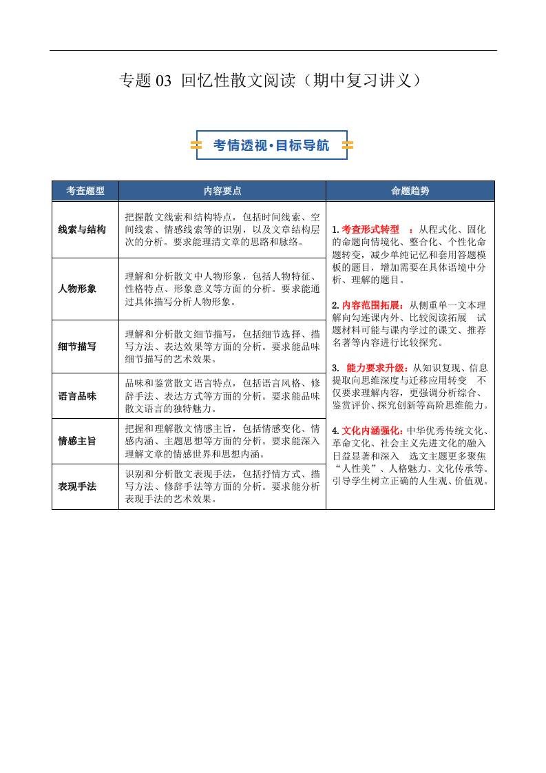 专题03 回忆性散文阅读(期中复习讲义)(原卷版)