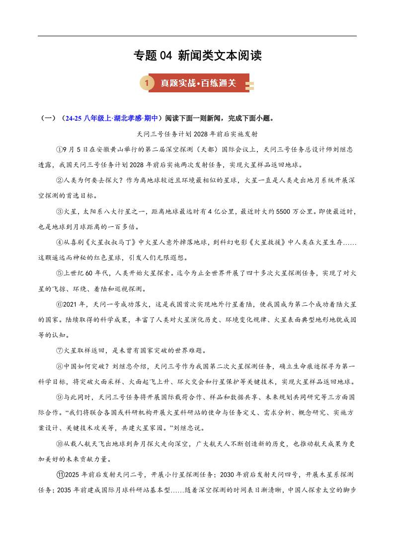 专题04 新闻类文本阅读(期中专项训练)(解析版)