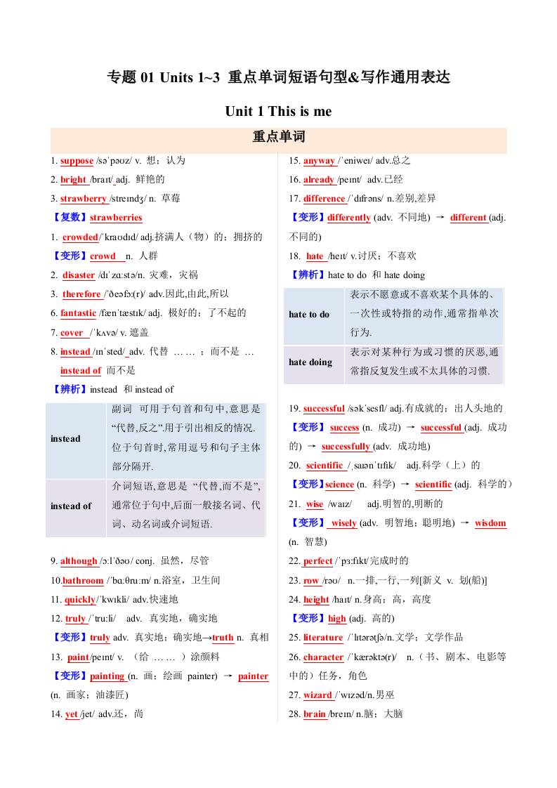 专题01 Units 1~3 重点单词短语句型&写作通用表达(期中知识清单)(背诵版)