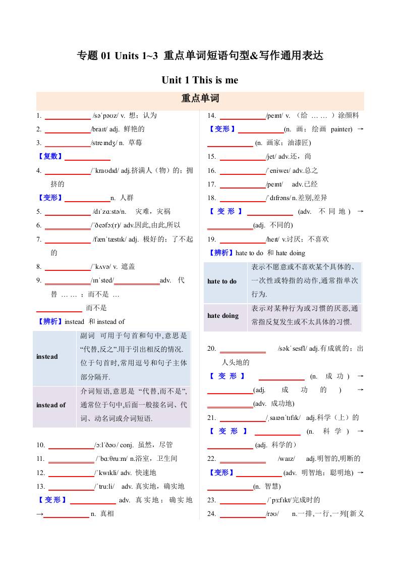 专题01 Units 1~3 重点单词短语句型&写作通用表达(期中知识清单)(默写版)