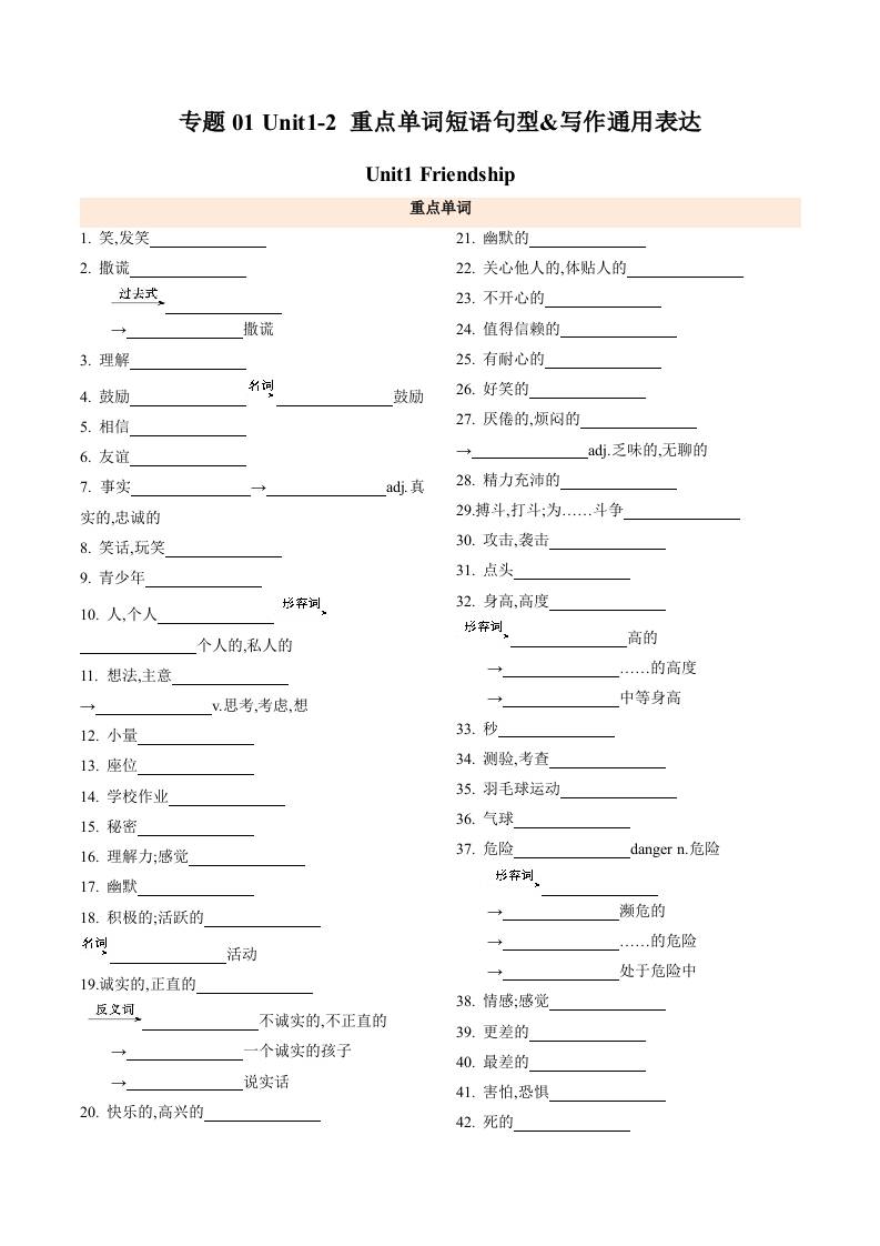 专题01 Unit1-2 重点单词短语句型&写作通用表达(期中知识清单)(默写版)