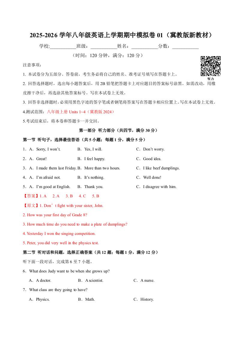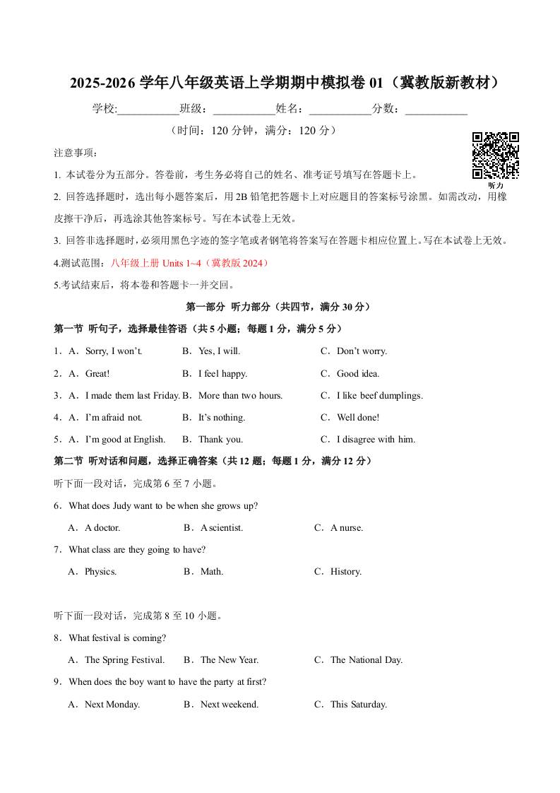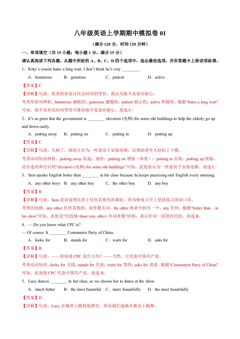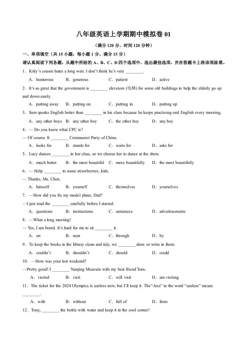 专题01期中模拟卷01(考试版A4)(译林版2024)
