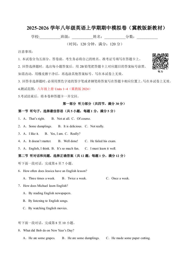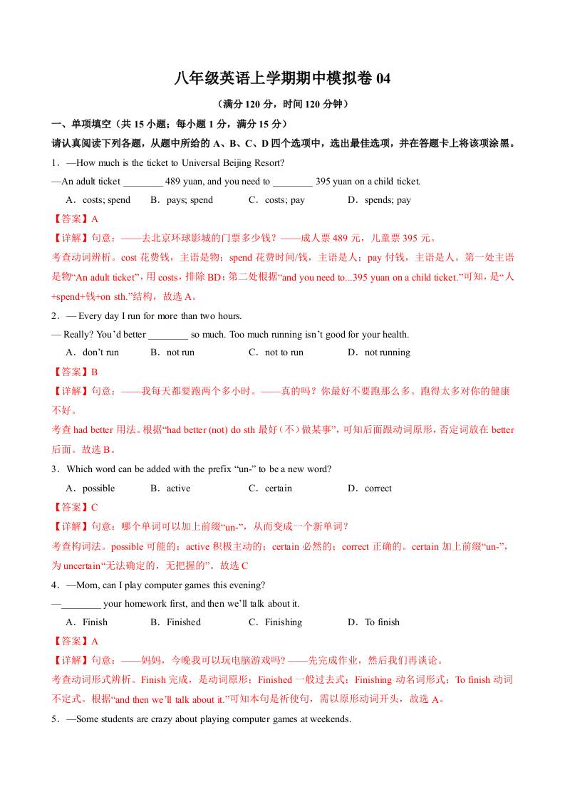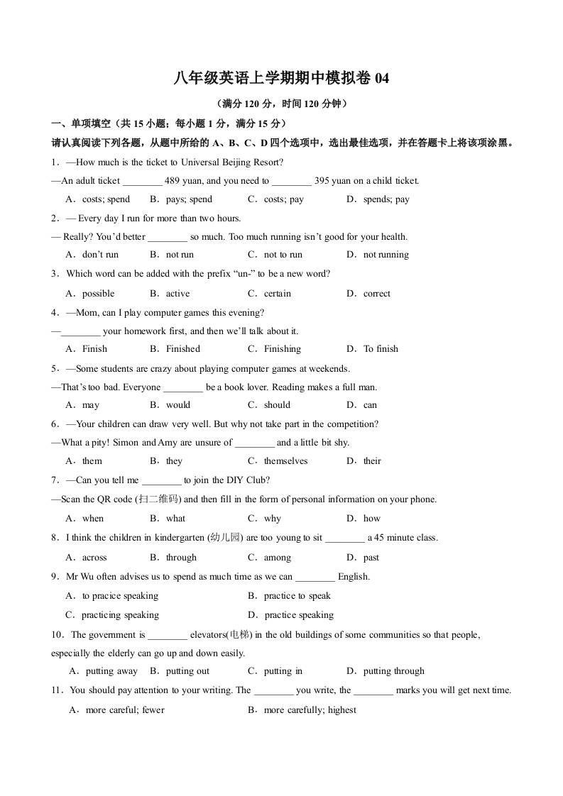 专题04期中模拟卷04(考试版A4)(译林版2024)