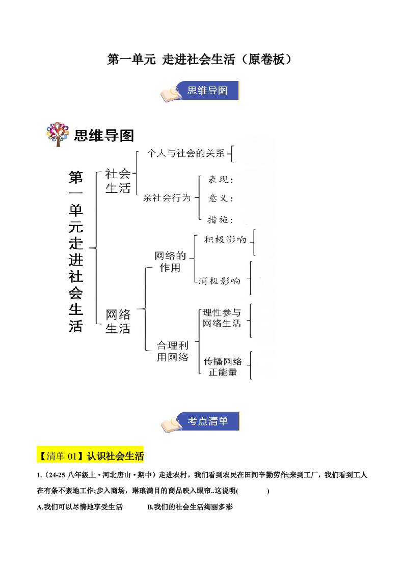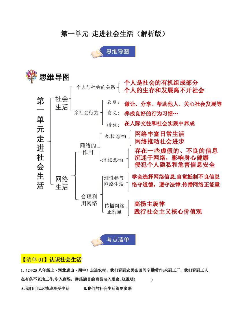 1.第一单元 走进社会生活(期中知识清单)(学生版)