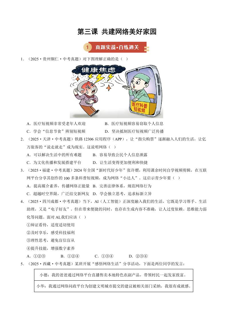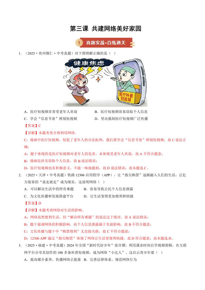 第三课 共建网络美好家园(期中专项训练)(学生版)
