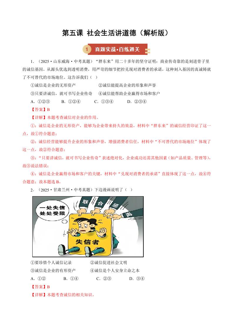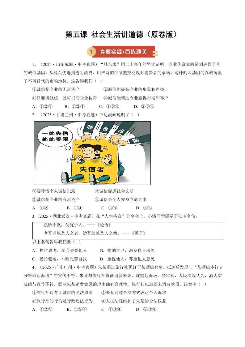 第五课 社会生活讲道德(期中专项训练)(学生版)
