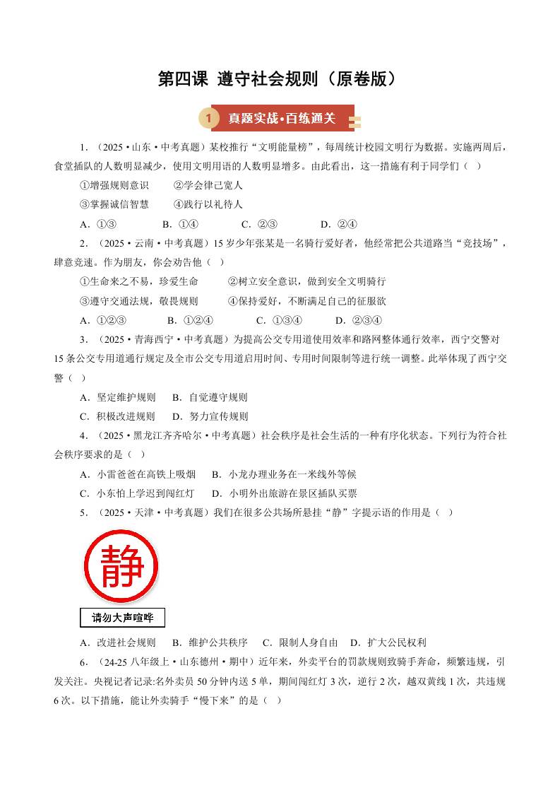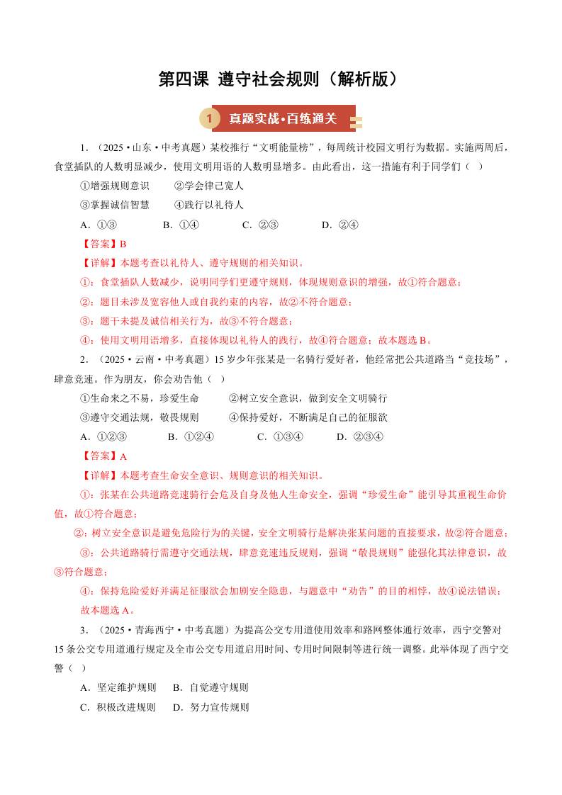 第四课 遵守社会规则(期中专项训练)(教师版)