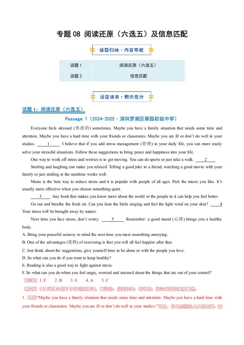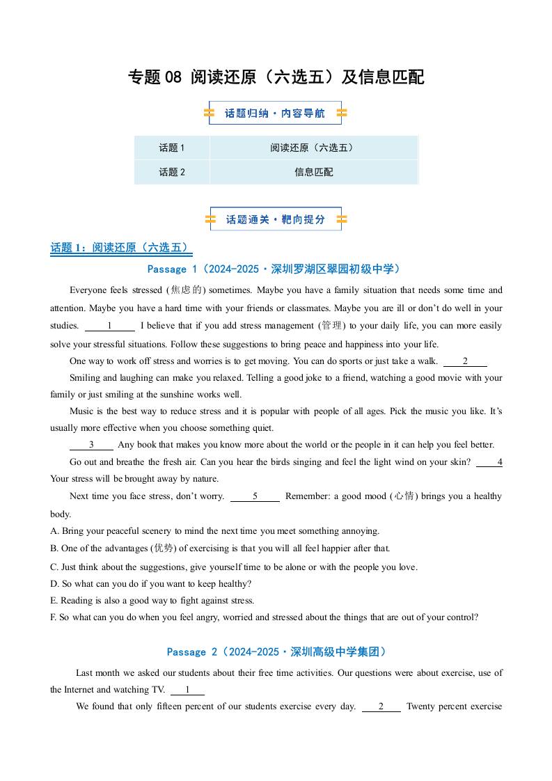 考前押题07 阅读还原六选五及信息匹配(期中专项训练)(学生版)