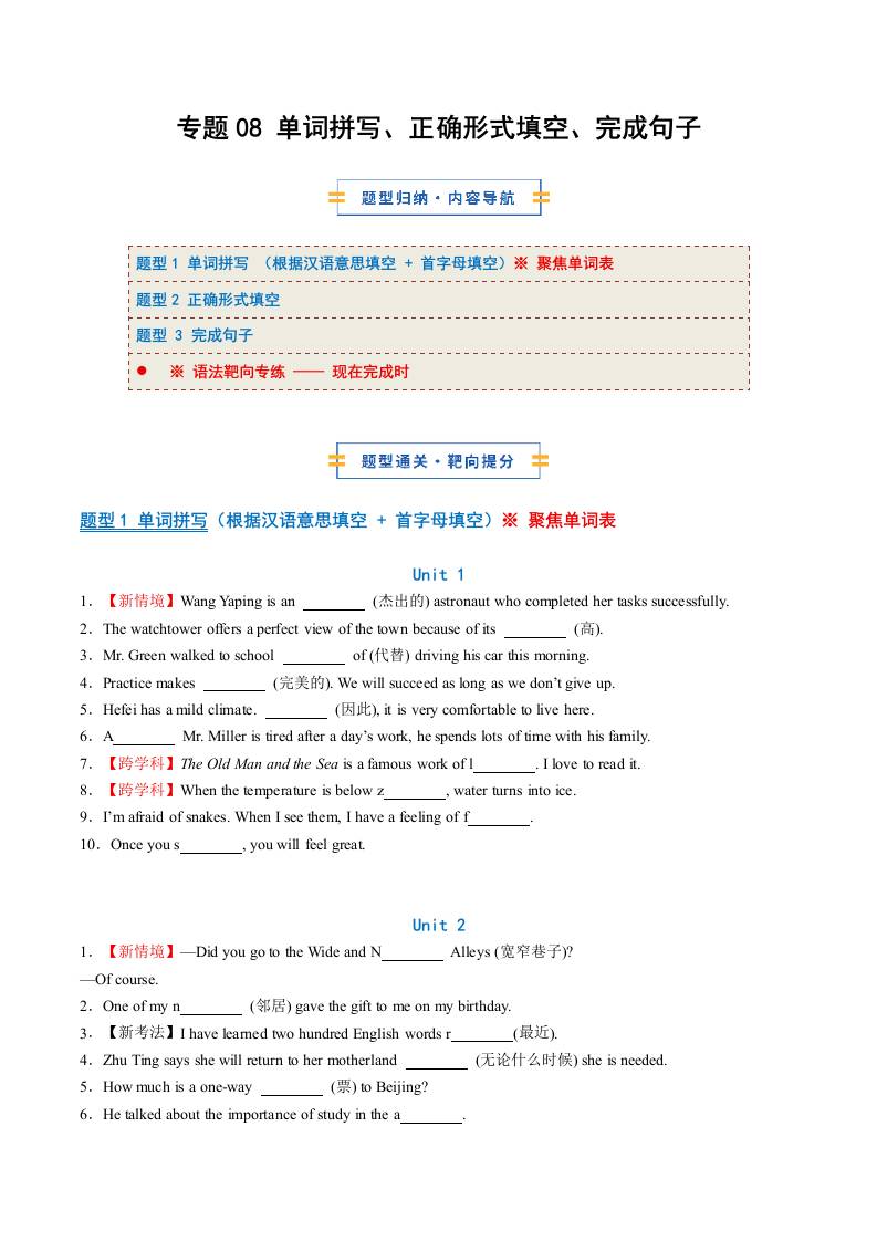 考前押题08 单词拼写、正确形式填空、完成句子(期中专项训练)(学生版)