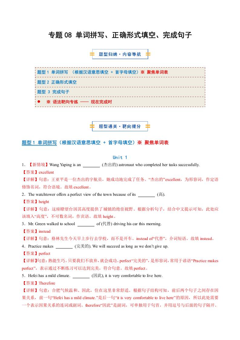 考前押题08 单词拼写、正确形式填空、完成句子(期中专项训练)(教师版)