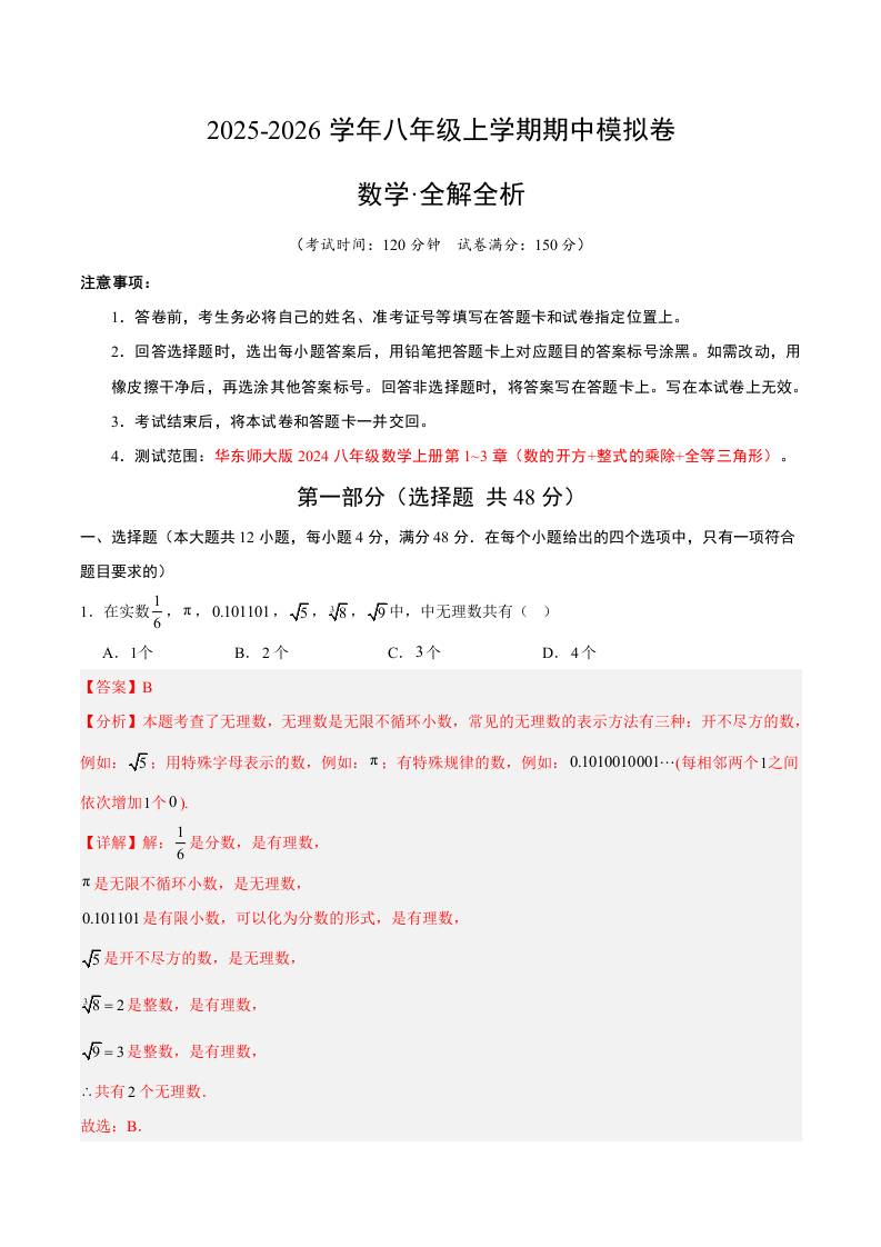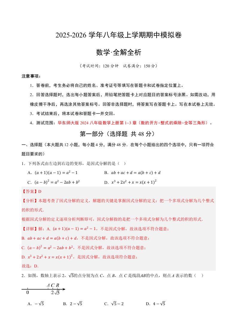 八上华师期中模拟卷01(全解全析)