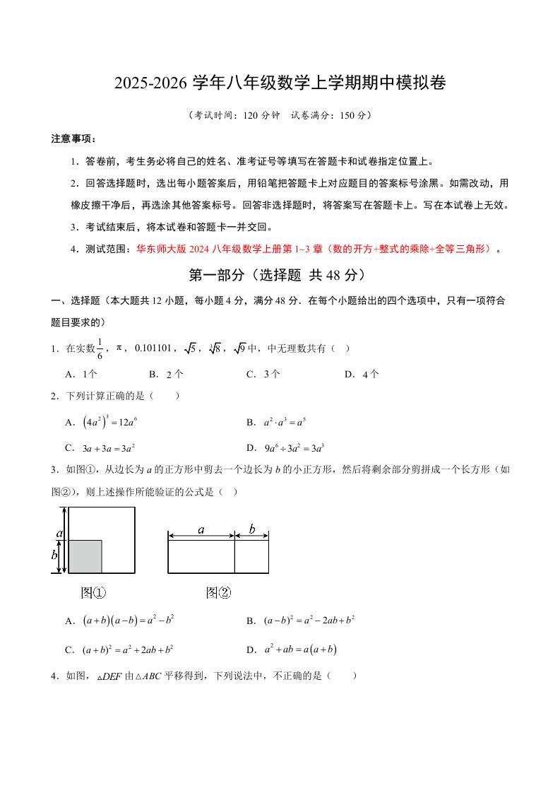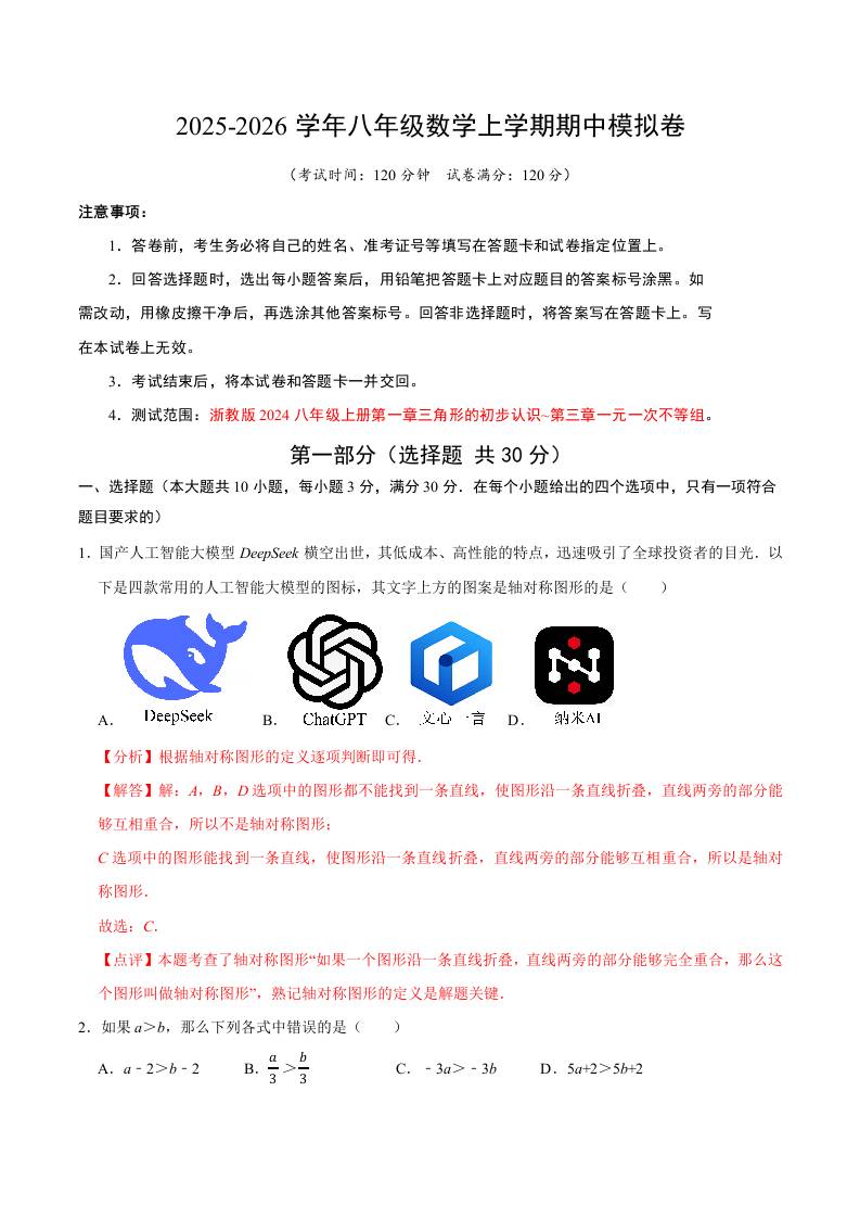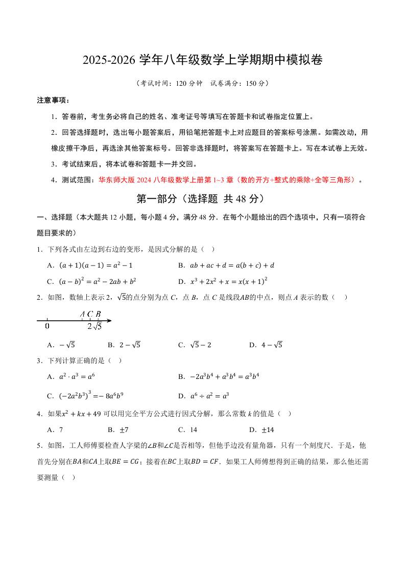 八上华师期中模拟卷01(考试A4版)