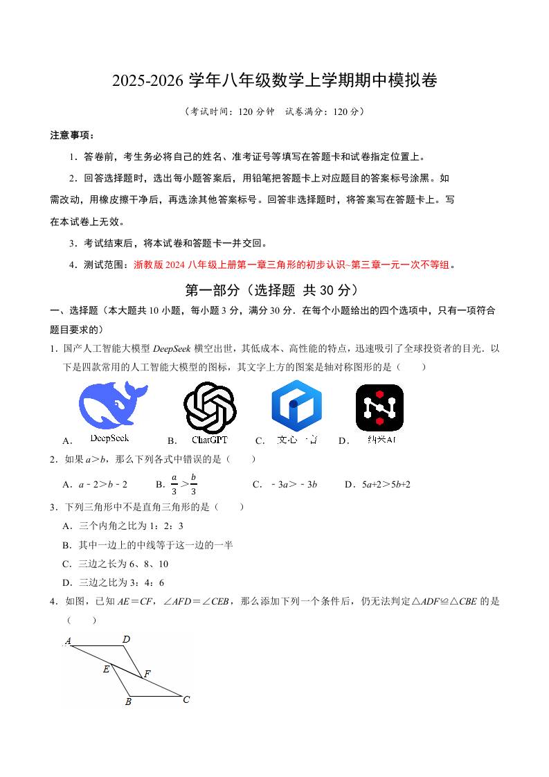 八上浙教期中模拟卷(考试版A4)