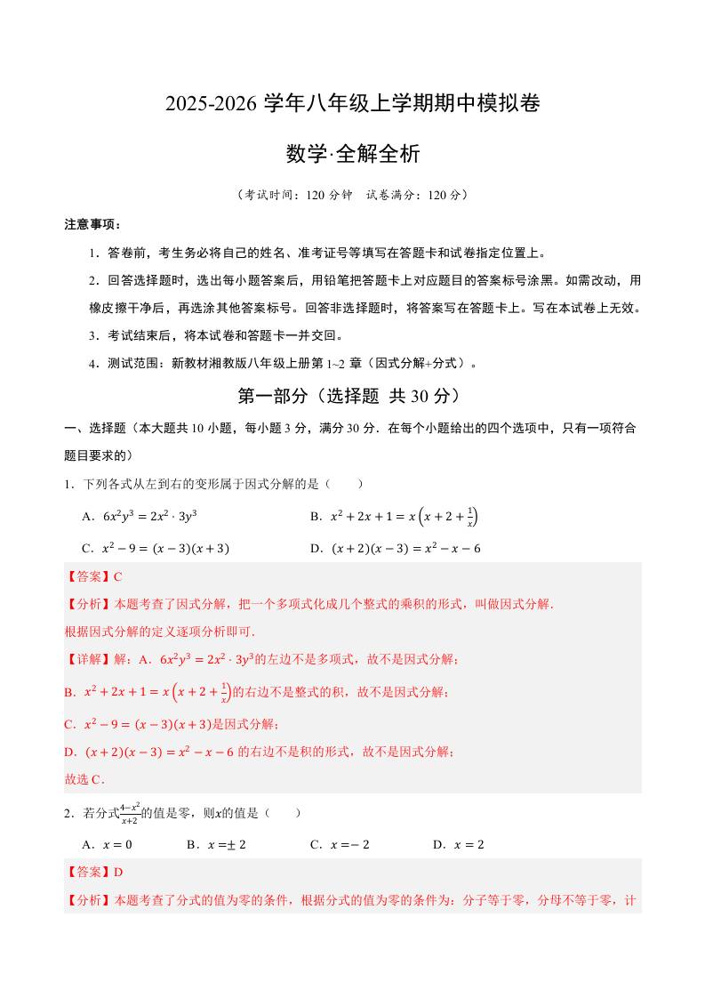 期中重难点检测卷(提高卷)(考试范围:1~3章 因式分解+分式+二次根式全部内容)(解析版)