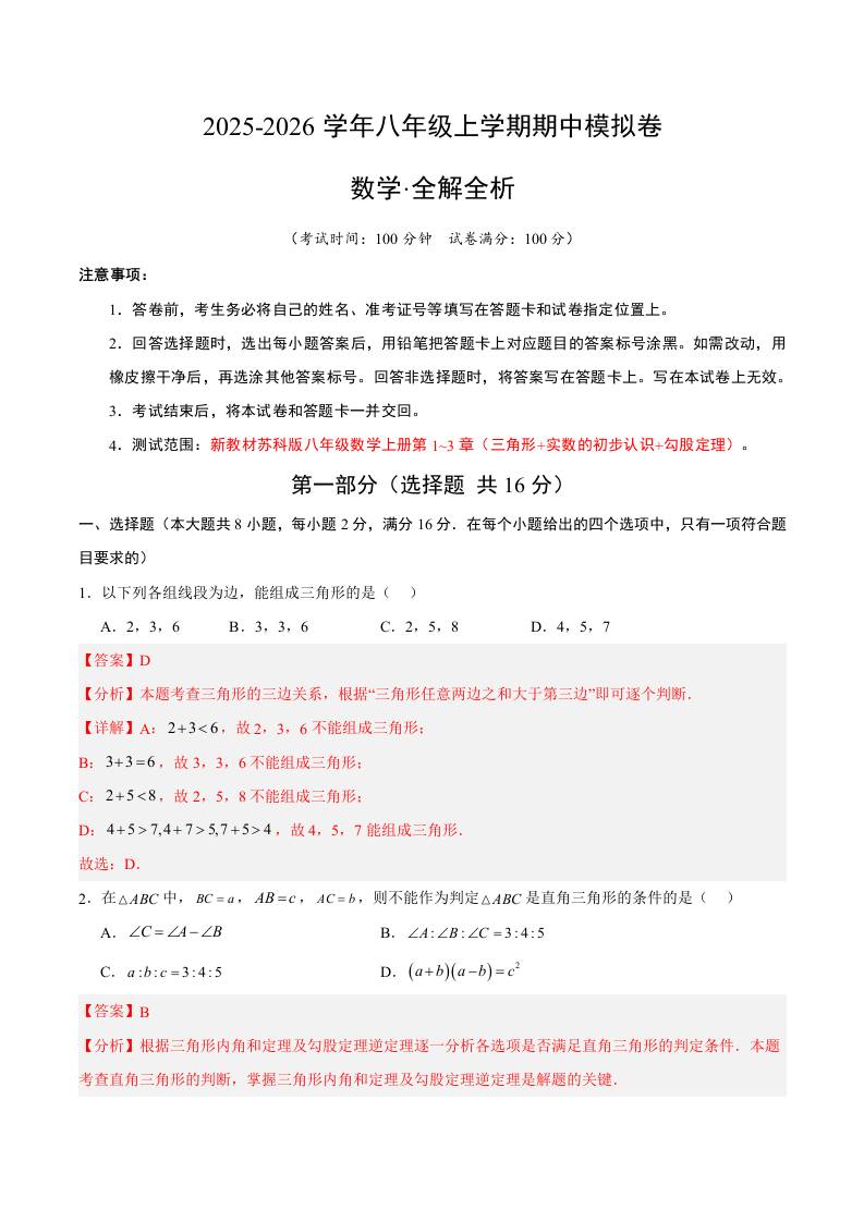 苏科期中模拟卷()(全解全析)
