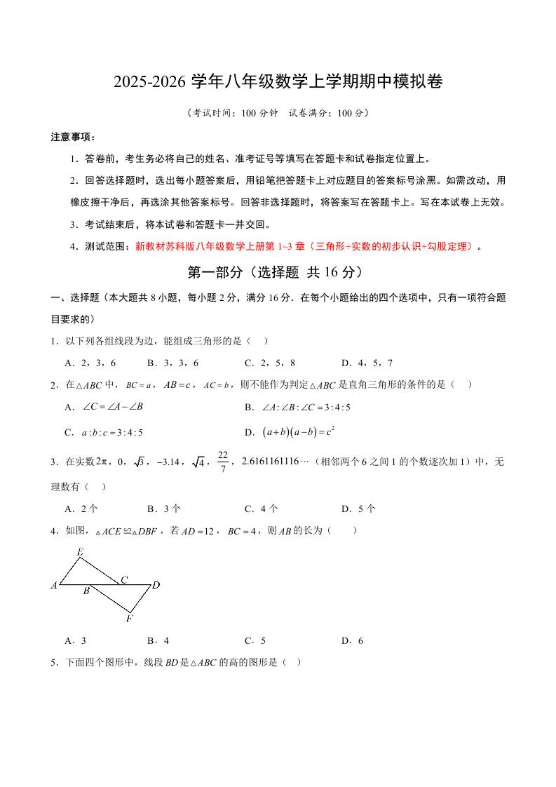 苏科期中模拟卷()(考试版A4)