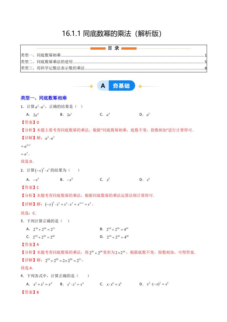 16.1.1同底数幂的乘法(分层作业)(教师版)