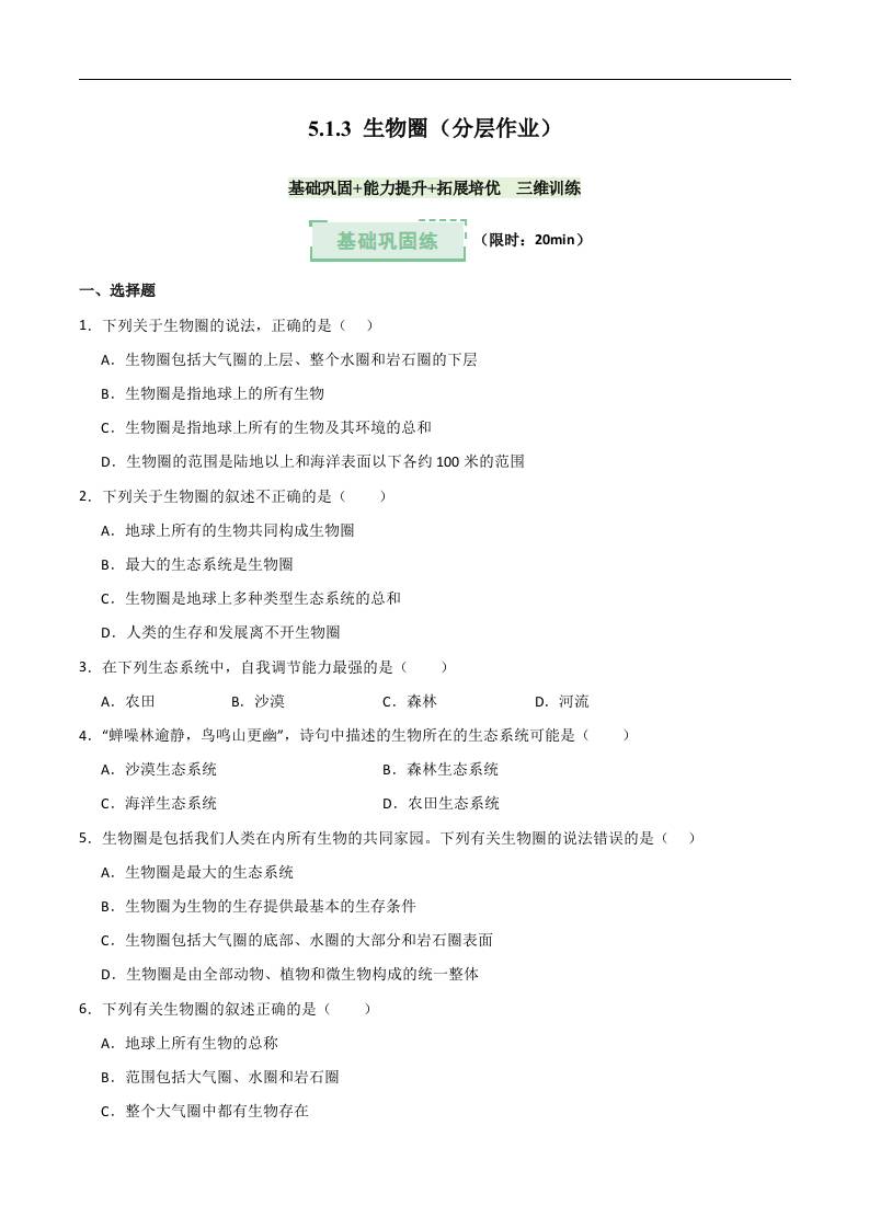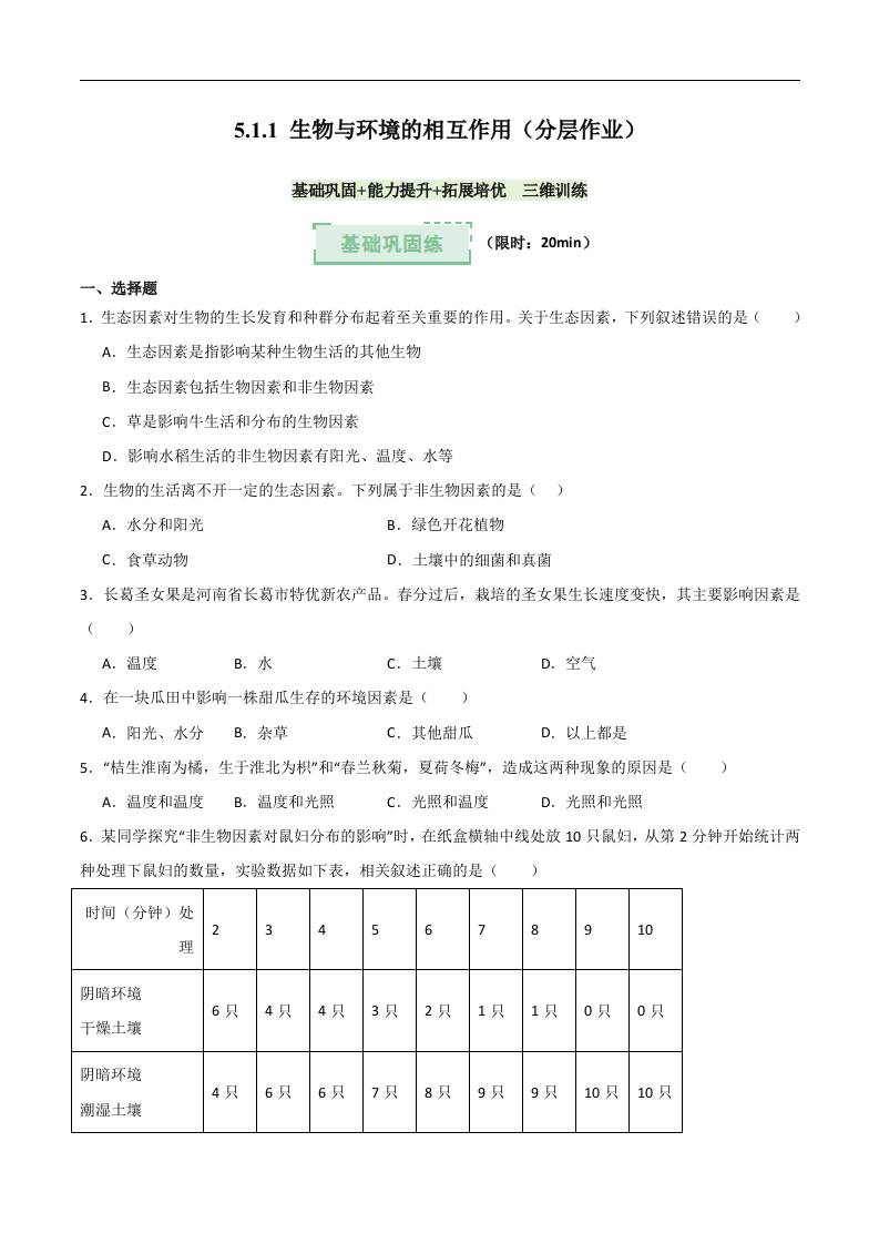5.1.1 生物与环境的相互作用(分层作业)(原卷版)