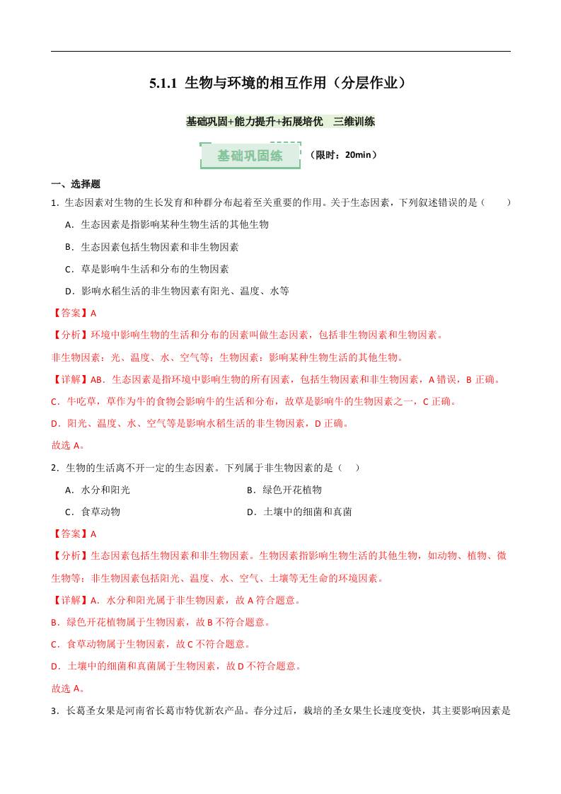 5.1.1 生物与环境的相互作用(分层作业)(解析版)