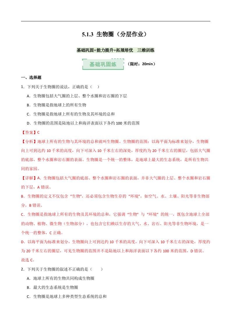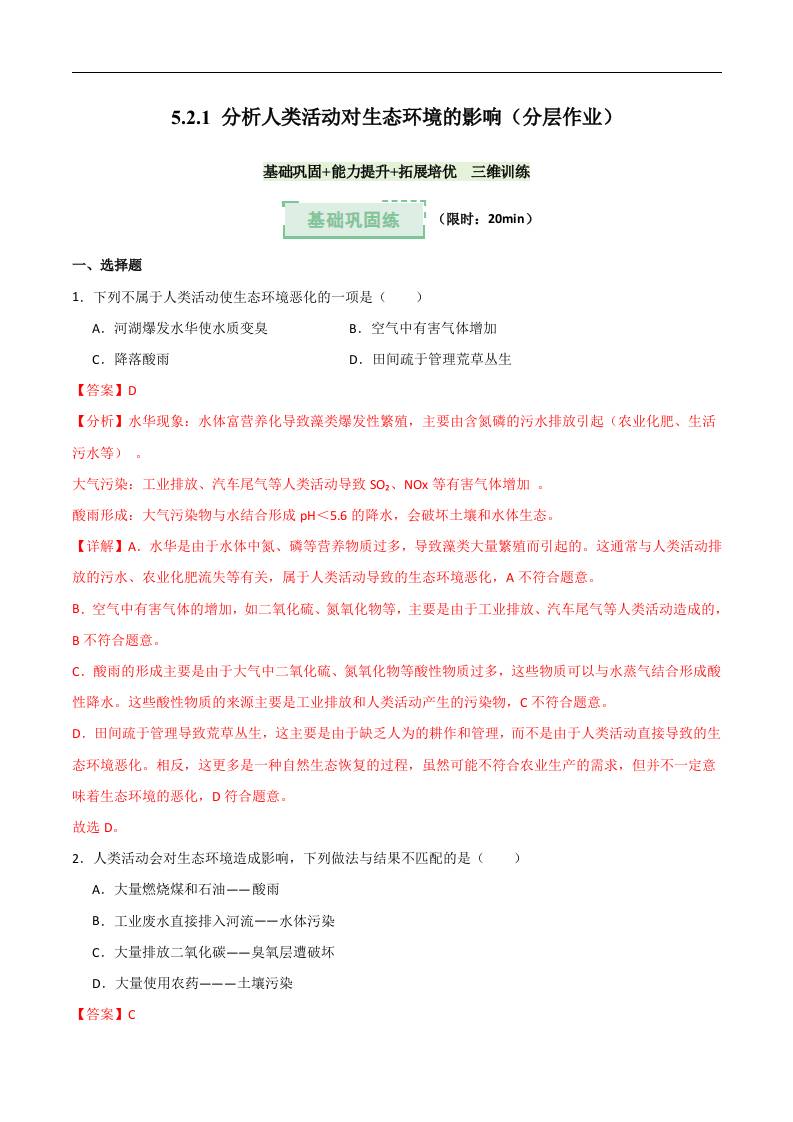 5.2.1 分析人类活动对生态环境的影响(分层作业)(解析版)