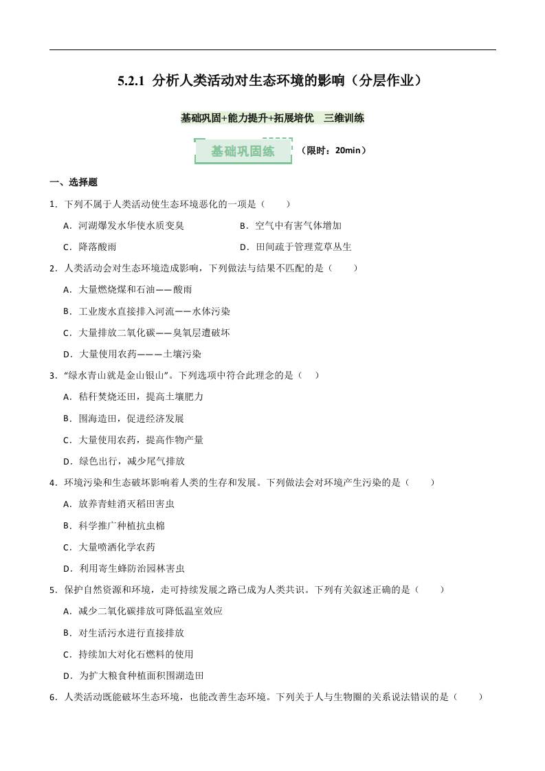 5.2.1 分析人类活动对生态环境的影响(分层作业)(原卷版)