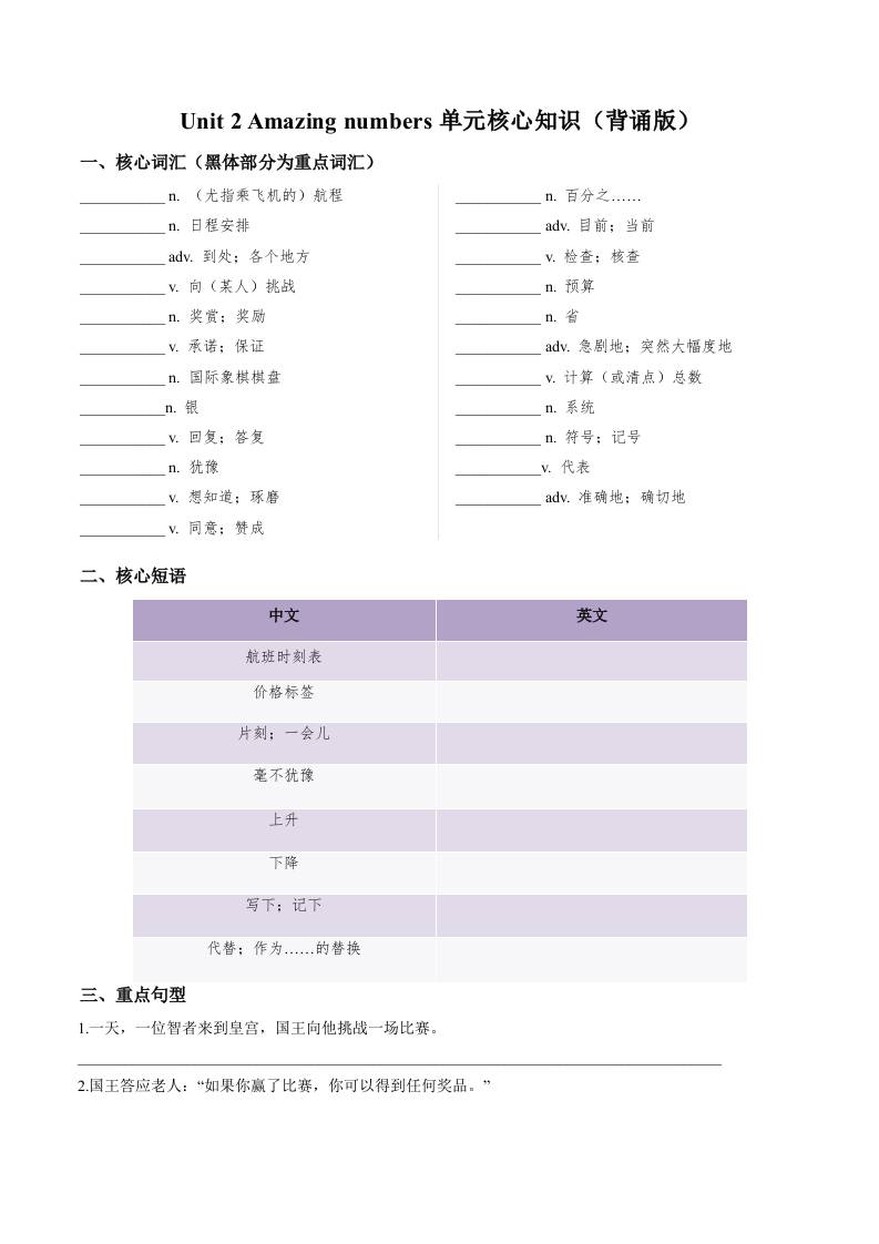 Unit 2 Amazing numbers(单元核心知识)(默写版).