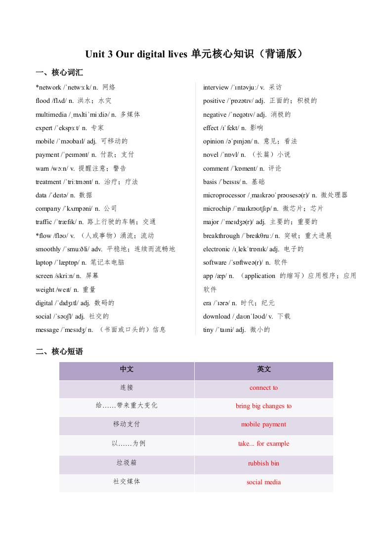 Unit 3 Our digital lives(单元核心知识)(背诵版).