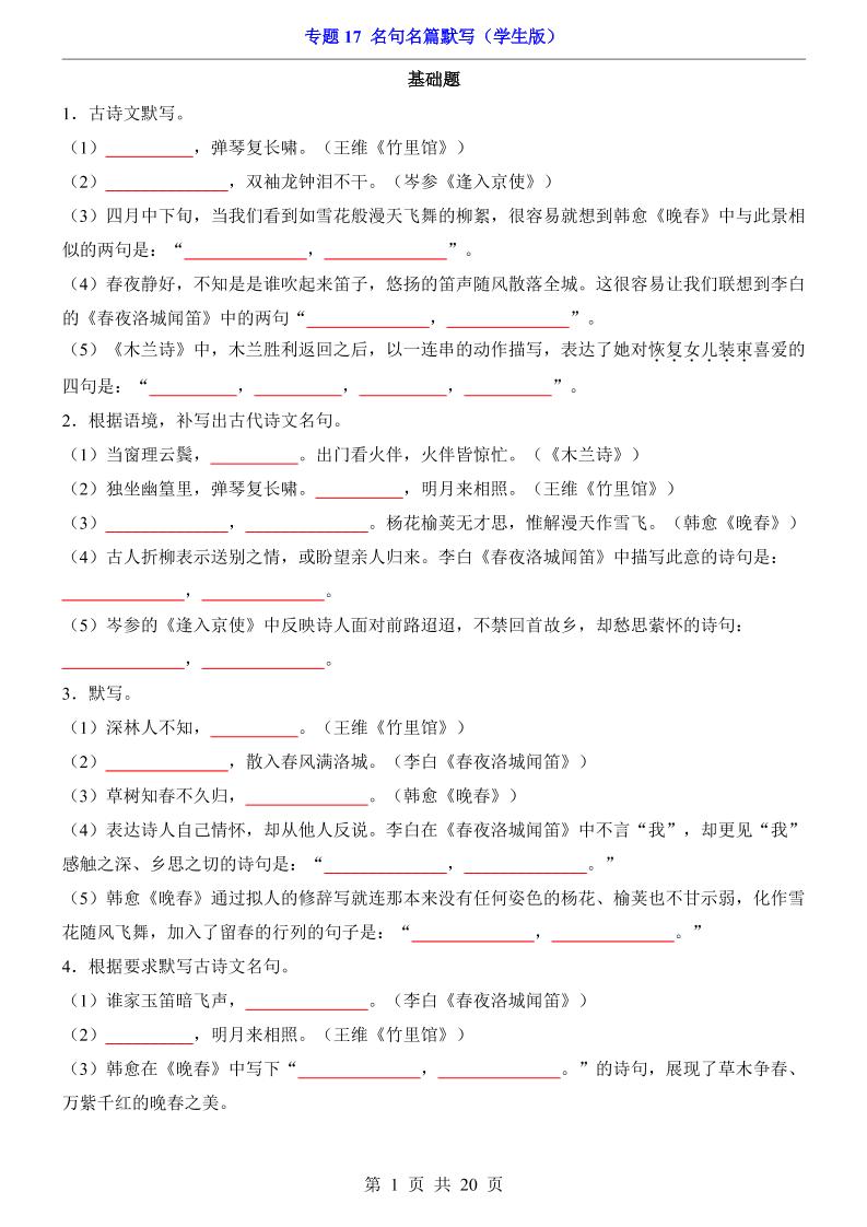专题17 名句名篇默写