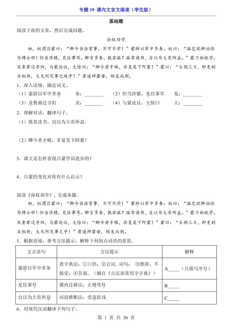 专题19 课内文言文阅读