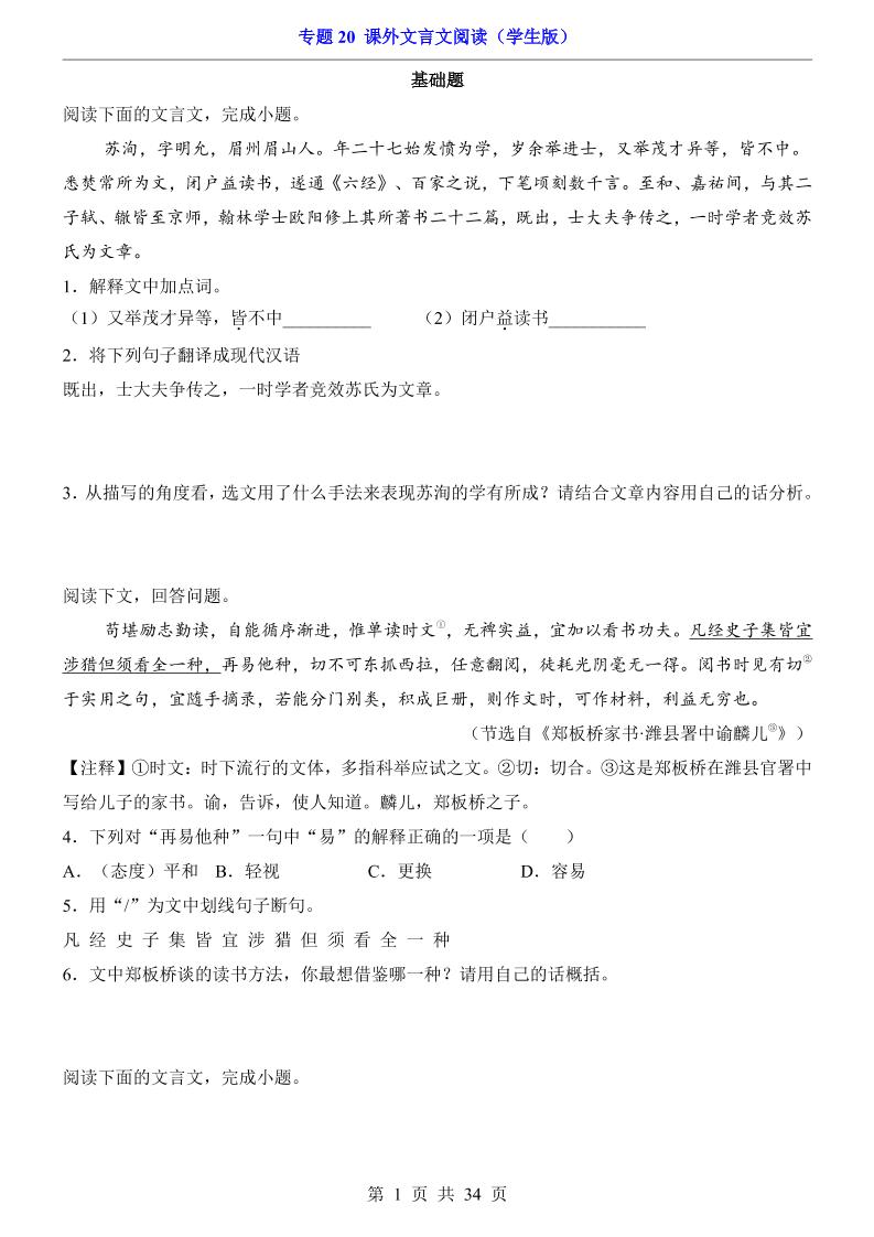 专题20 课外文言文阅读