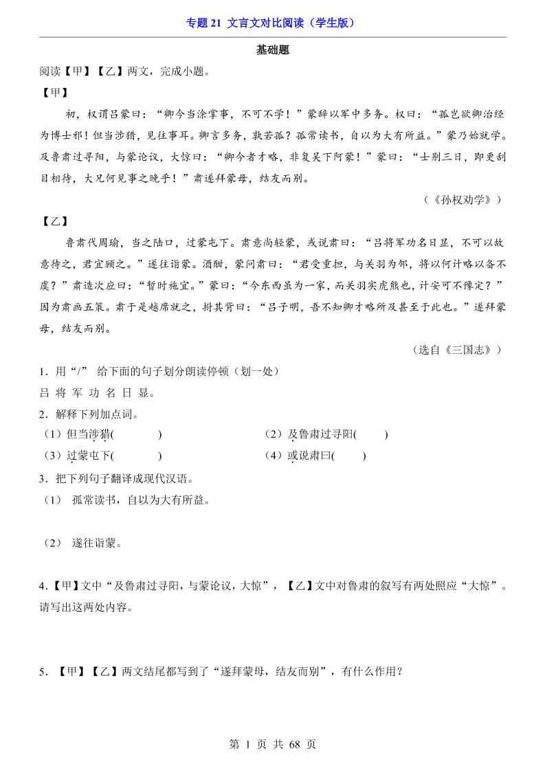 专题21 文言文对比阅读