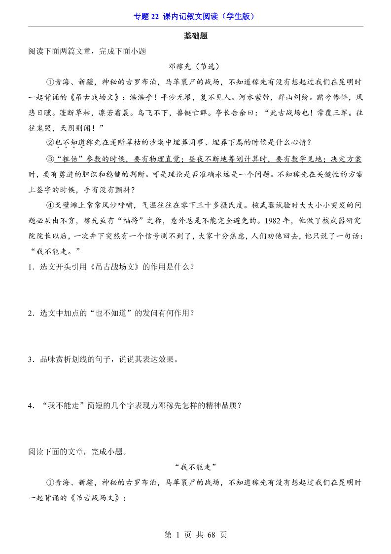专题22 课内记叙文阅读