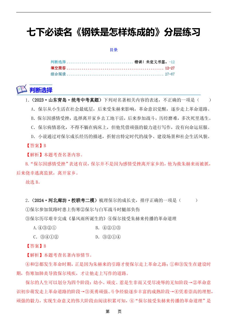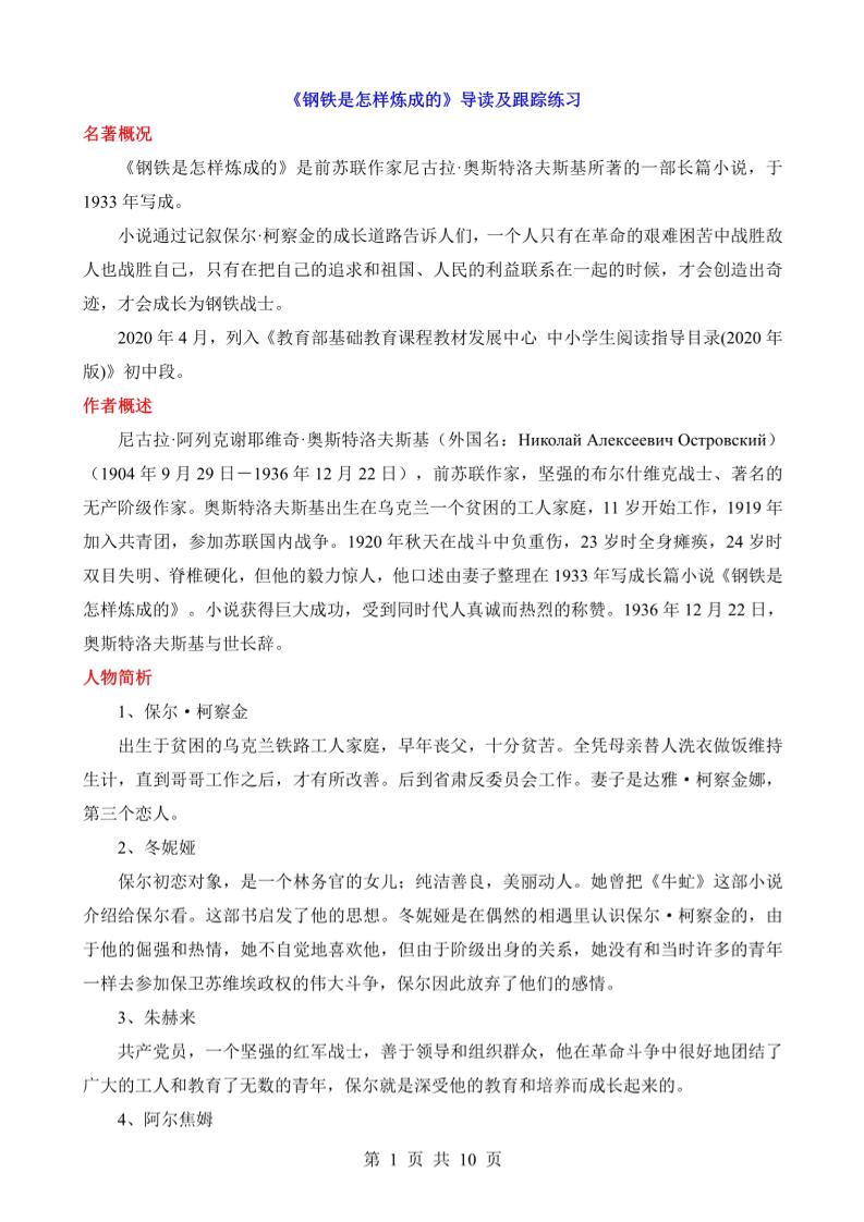 《钢铁是怎样炼成的》导读及跟踪练习