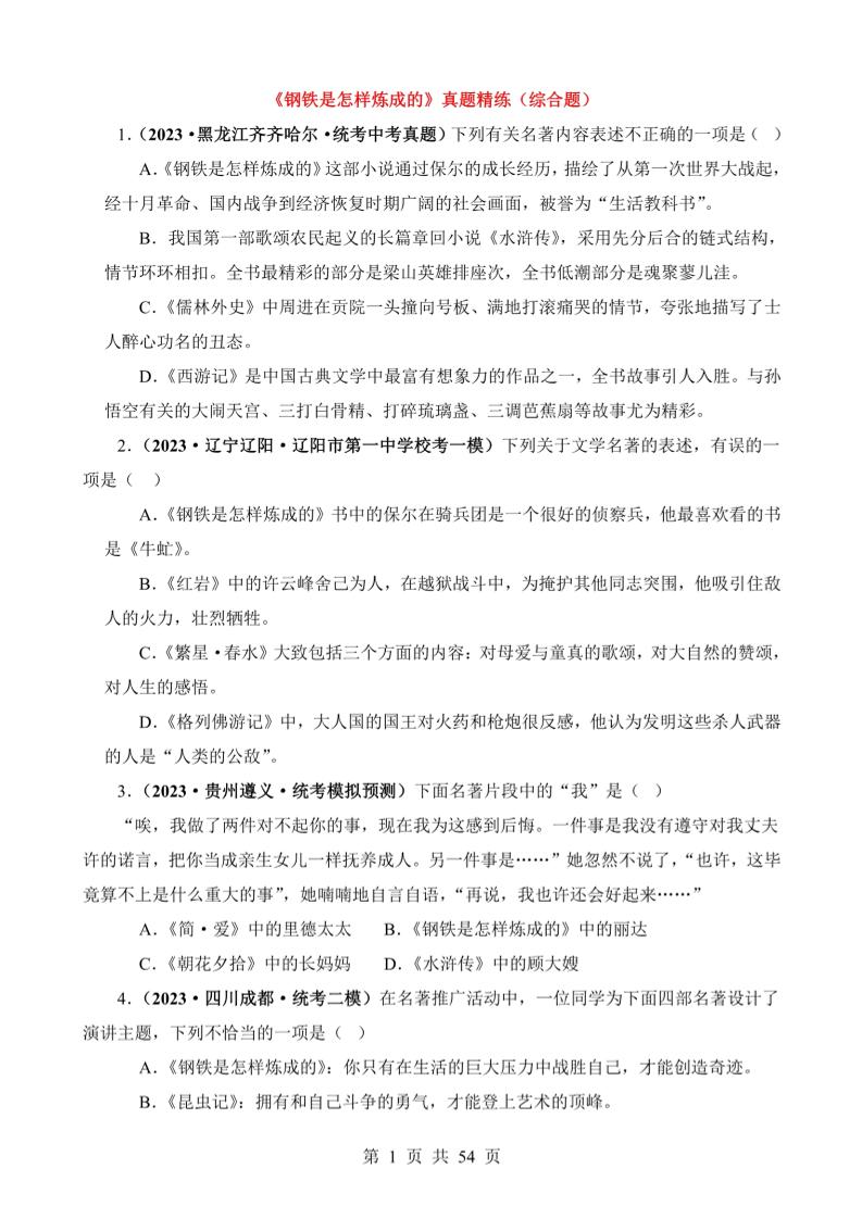 《钢铁是怎样炼成的》真题精练(综合题)