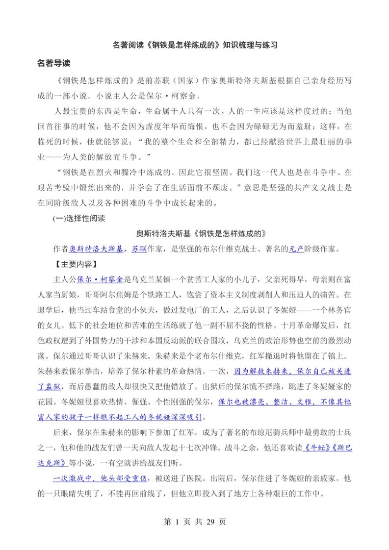 《钢铁是怎样炼成的》要点梳理与练习