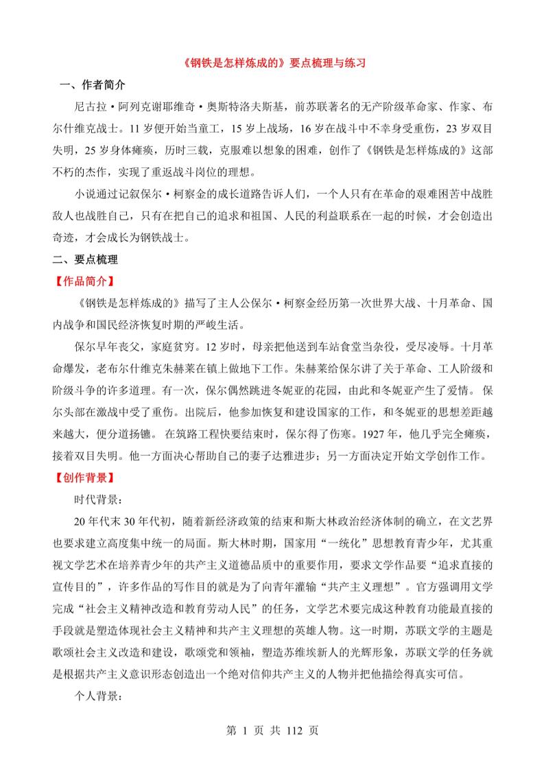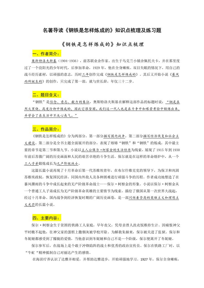名著导读《钢铁是怎样炼成的》知识点梳理及练习题(教师版)